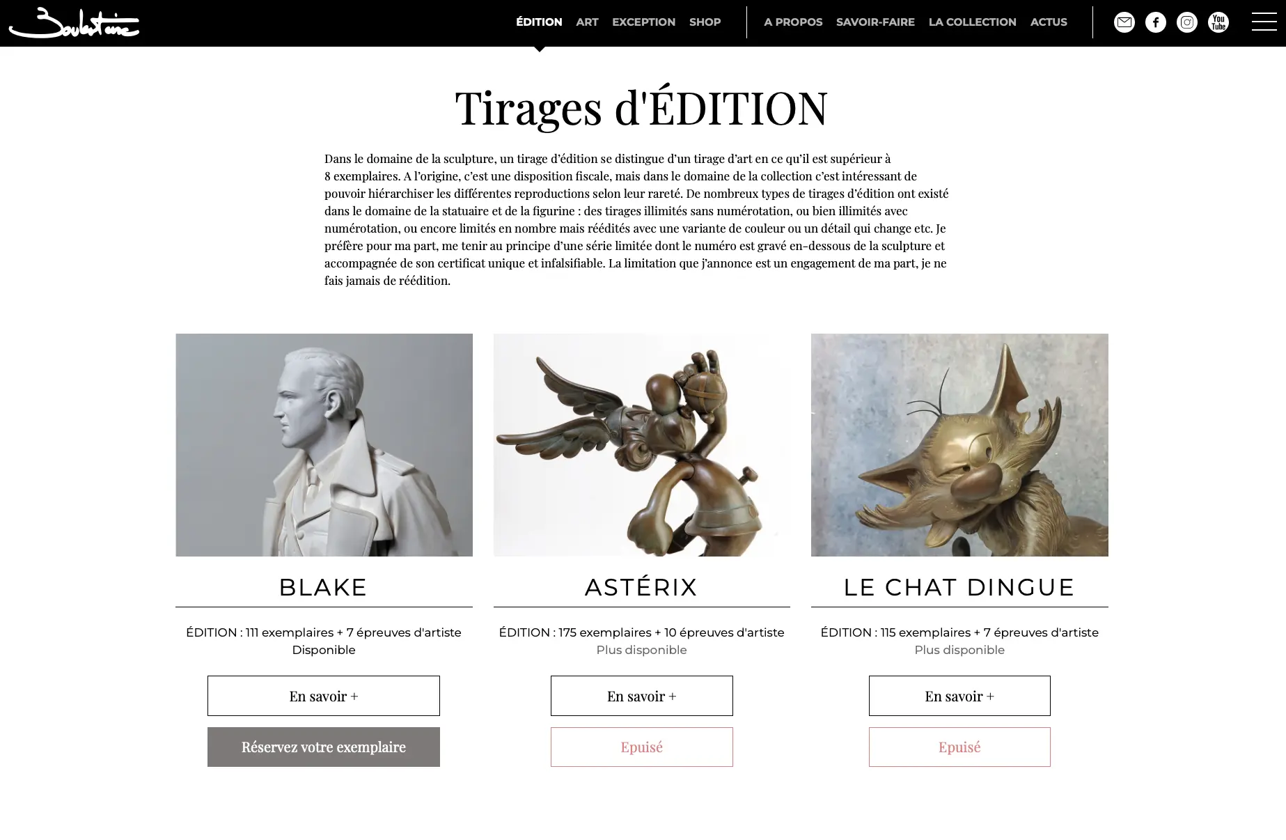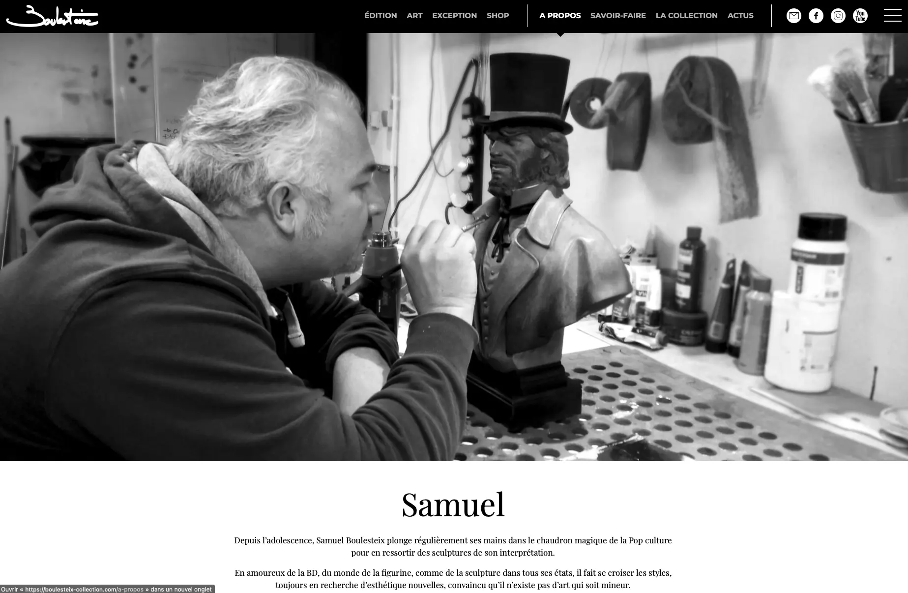 Samuel disposait déjà d’un site personnel, mais celui-ci ne mettait en valeur ni son travail ni ses différentes séries de sculptures. Il avait besoin d’un site moderne et structuré, afin de présenter ses créations par catégorie, valoriser ses tirages d’édition limités, et bénéficier d’un outil simple pour actualiser ses contenus.