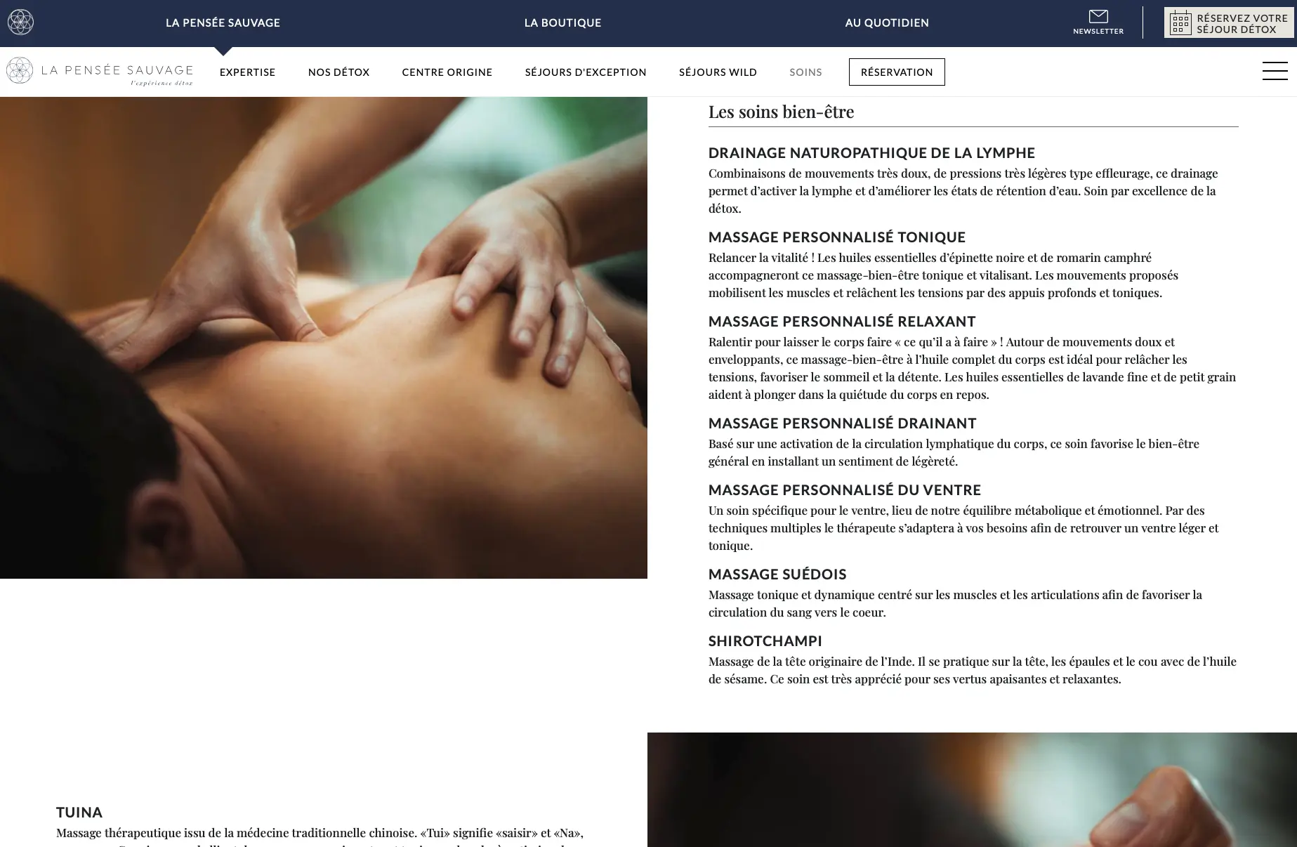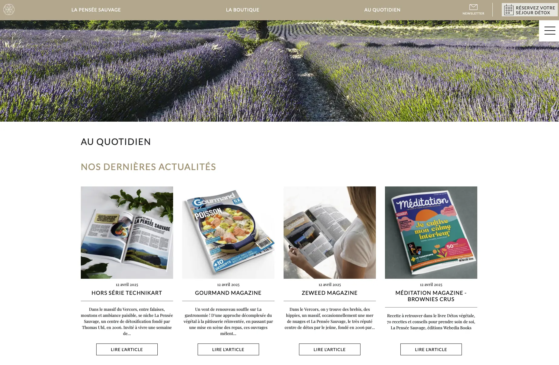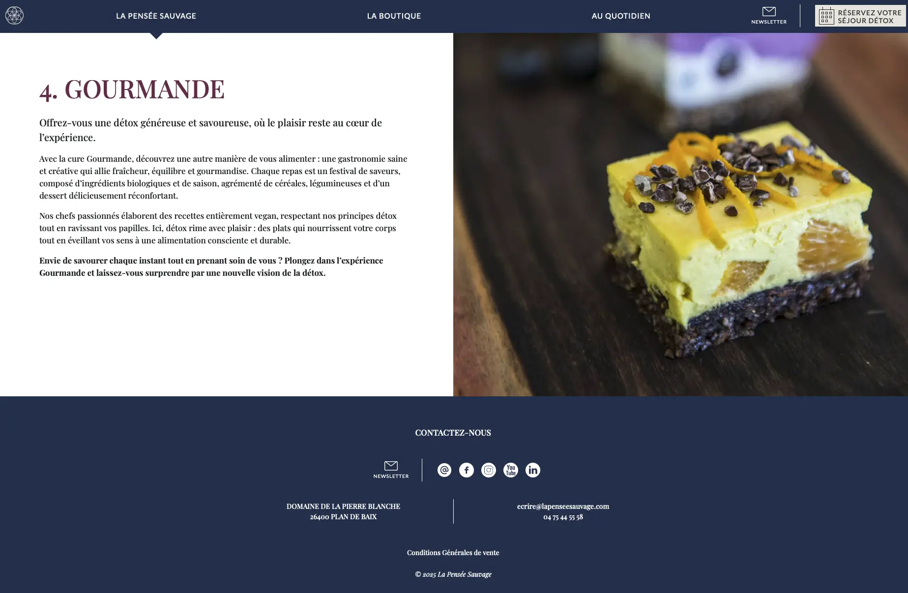 Pour soutenir le développement de son activité, La Pensée Sauvage avait besoin de repartir sur des bases solides grâce à un site entièrement refondu. Son objectif était de mieux présenter ses services, valoriser ses actualités et ses recettes, et proposer une expérience de réservation fluide et fiable.