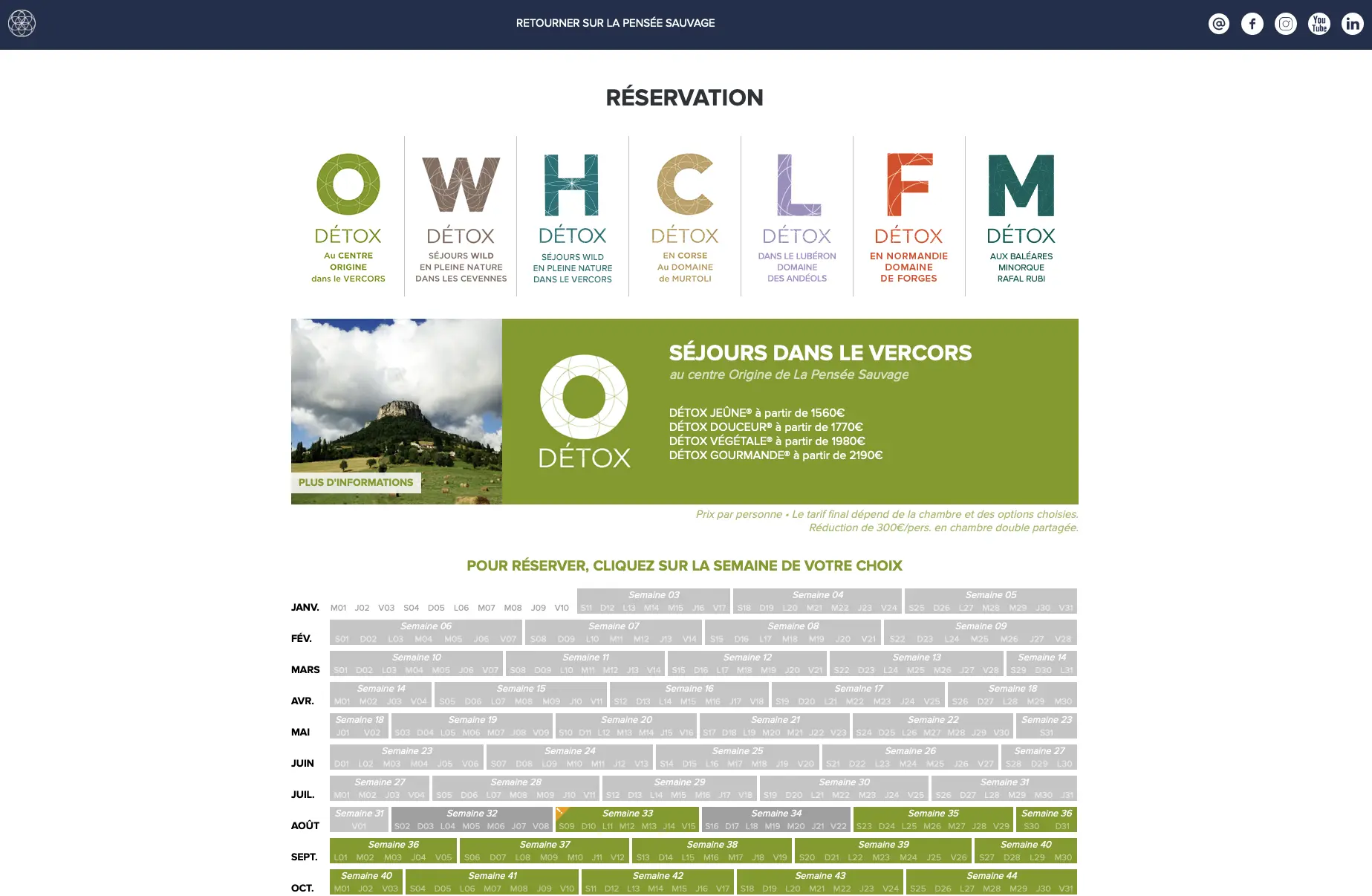 Mathieu, notre UX designer, a assuré la refonte complète du site web en y intégrant le design conçu par Fabien Barral, un graphiste avec lequel il collabore. Le site a été réalisé sur Joomla 3, et avec Bootstrap 4 pour une interface responsive. Il repose sur le CCK Zoo couplé à Zoo Landers pour la gestion des contenus dynamiques. Un travail spécifique a été mené en PHP sur le système de réservation, basé sur le composant « Event Booking » : ce dernier a été personnalisé pour servir de fondation à l’ensemble des données liées aux séjours. Le nouveau site web de La Pensée Sauvage est clair, fonctionnel et fidèle à son esprit sauvage.